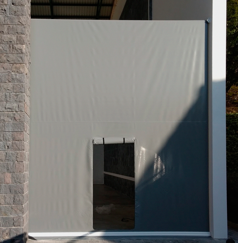 Modelo de montaje sencillo, con recogida vertical y sujeción al suelo. Posibilidad de instalación con guías laterales (guía de aluminio, varilla, cable o cremallera) y ventanas transparentes de diferentes formas.